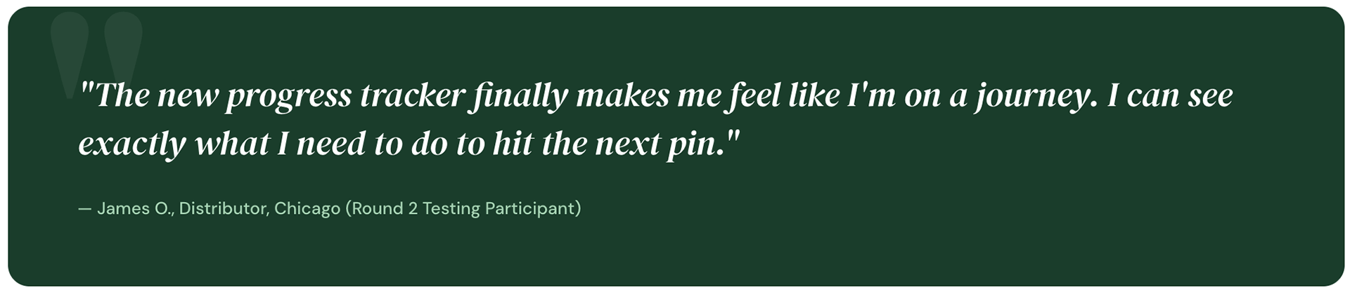 8 participants using clickable Figma prototypes. Key tasks: check this month's volume, identify top performing downline member, navigate to Progress Tracker.
