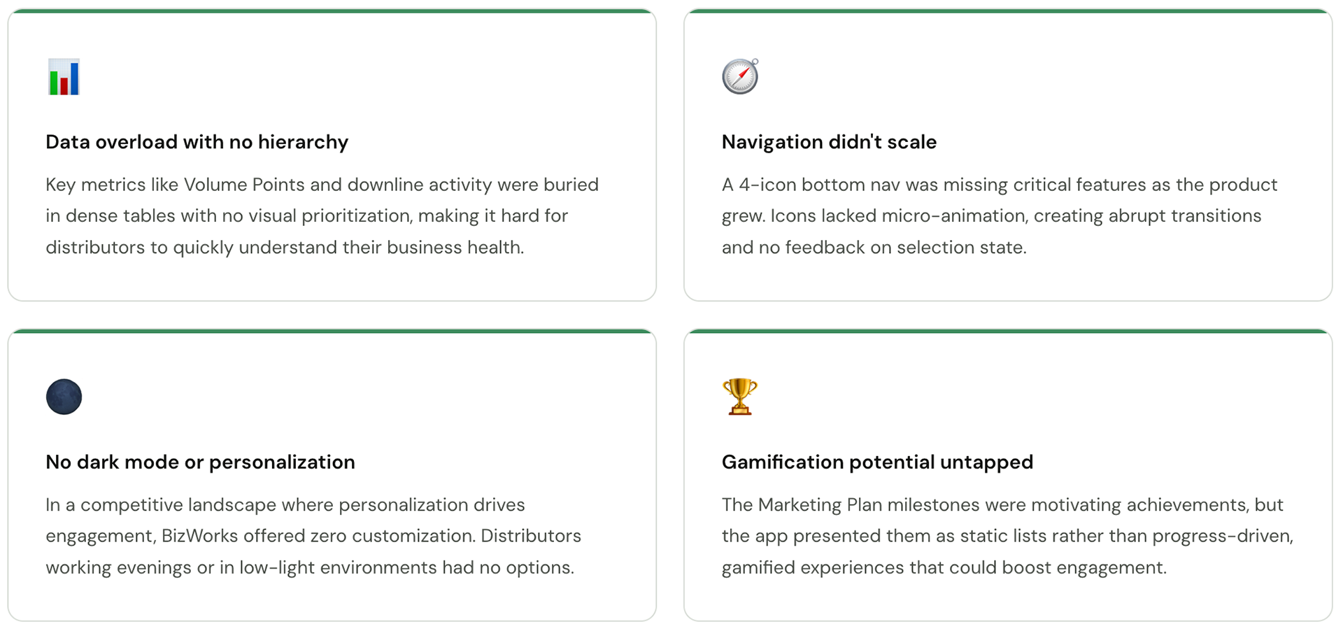 BizWorks had accumulated years of feature additions without a coherent design direction. Distributors were struggling with data-heavy screens that were hard to scan, navigation that didn't scale to a growing feature set, and an interface that lacked the visual quality expected of a premium paid product.