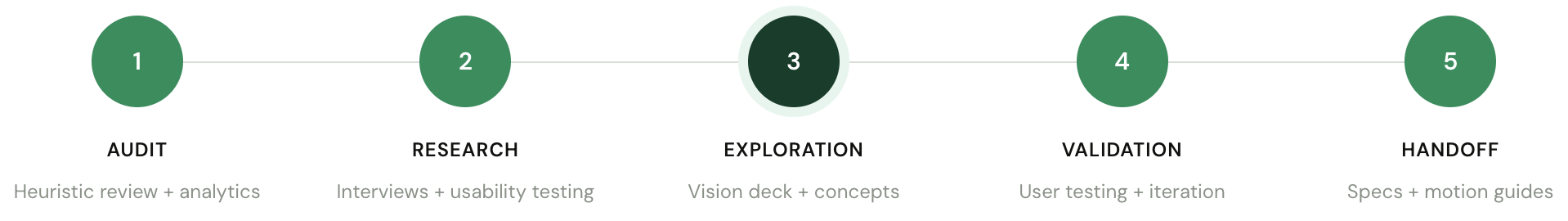 Given the scale and sensitivity of the platform, we structured our work in phases — moving from audit and principles, through explorations, to a validated vision deck that could inform the live roadmap.