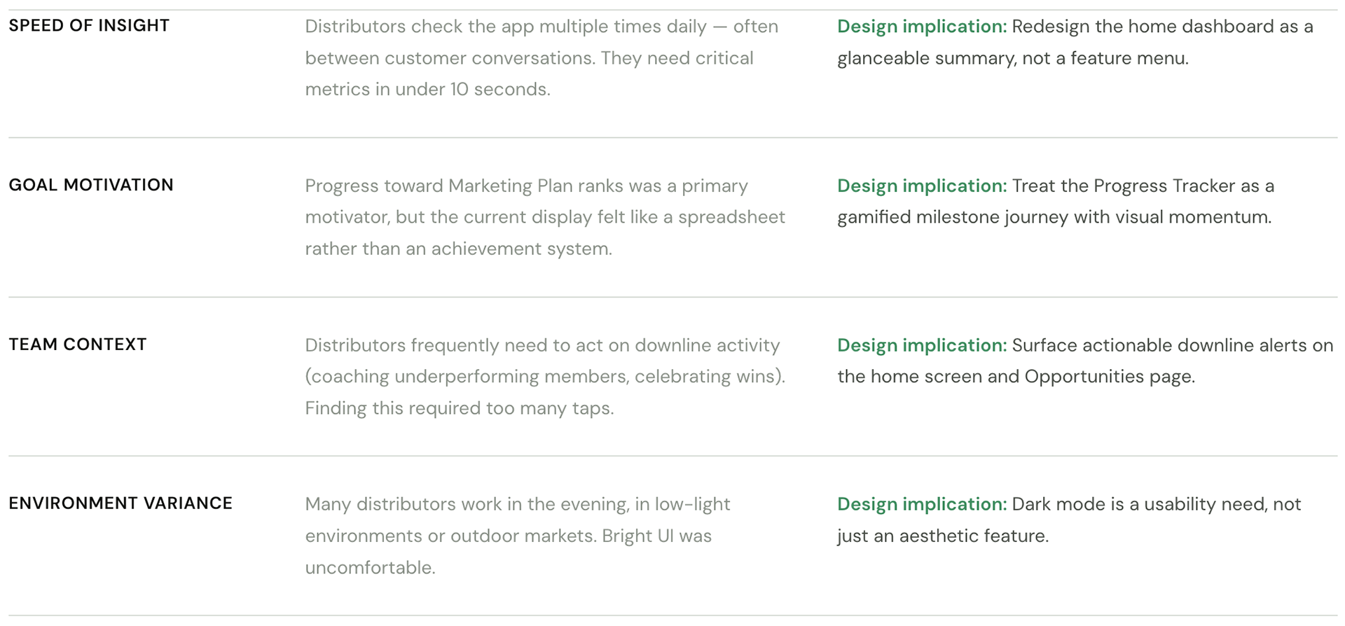 Before designing anything, we ran a mixed-methods research sprint to understand distributor workflows, pain points, and the mental models they brought to the app.