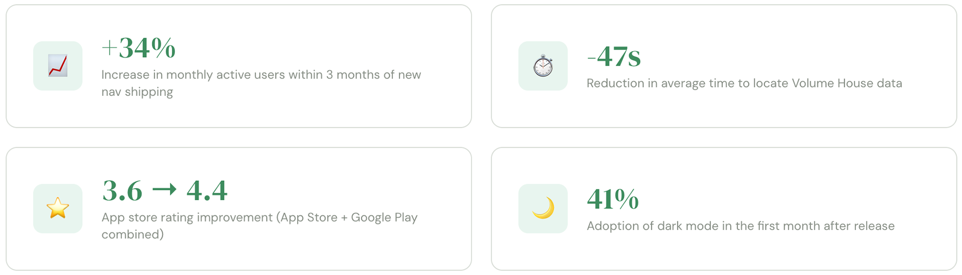 Mean task completion time dropped from 4.3 minutes to 1.8 minutes. SUS score improved from 52 to 81 — crossing the "Good" threshold for the first time. Dark mode was rated "highly preferred" by 74% of participants who worked evenings.