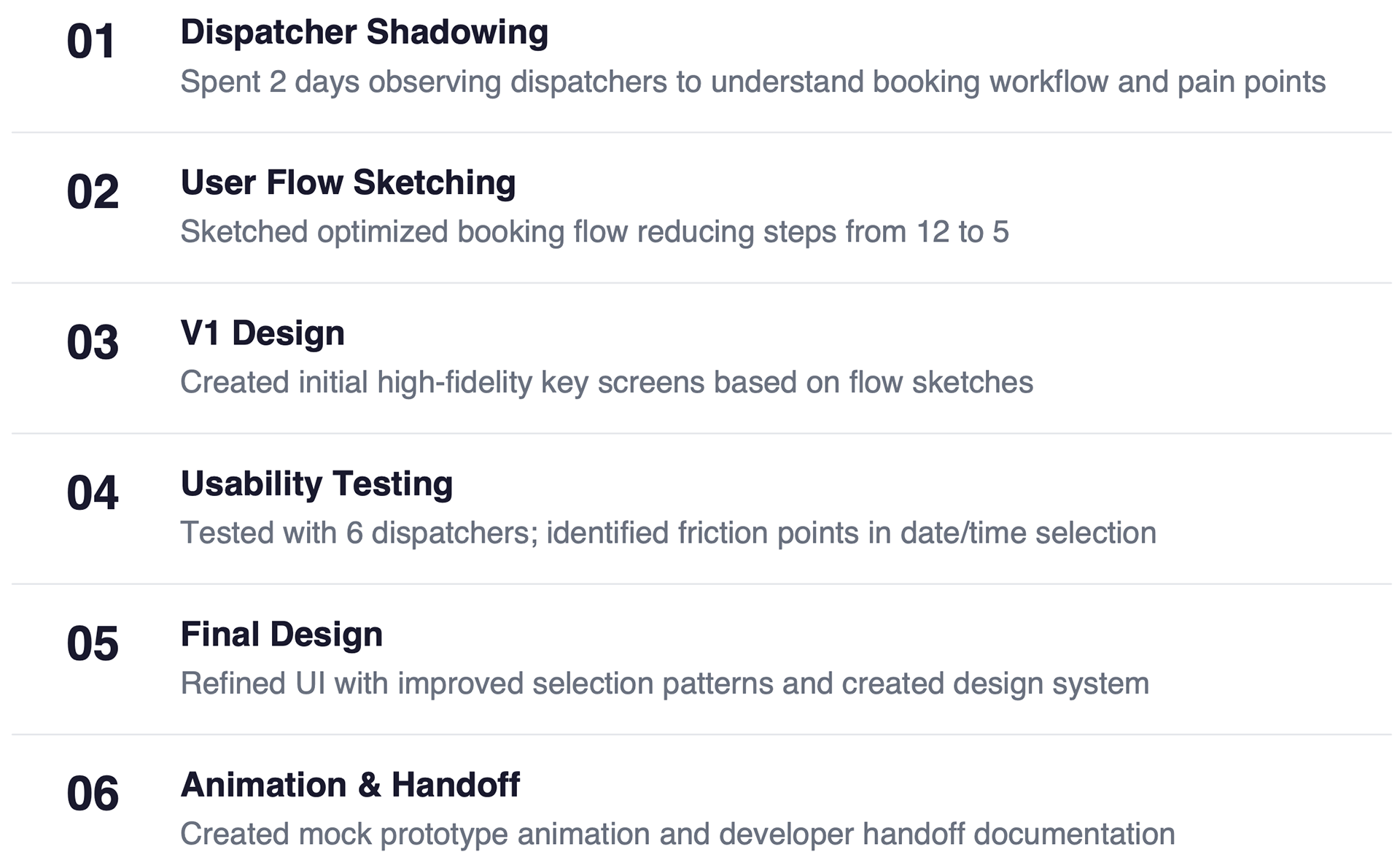 Created a streamlined mobile booking app for dispatchers with a simplified flow optimized for speed. Eliminated map functionality (routes were fixed) and focused on rapid booking with minimal taps. Included a custom design system for consistency across the dispatcher interface.