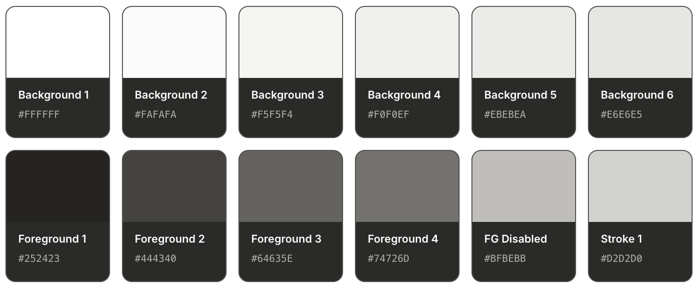 The neutral layer is where the real work happens. Background 1 through 6 give designers a choice of depth without ever picking a hex; each level knows its own Hover, Pressed, and Selected state, and each theme automatically remaps. This is the part of the old system that was most broken — and the part that unlocked the most velocity once fixed.