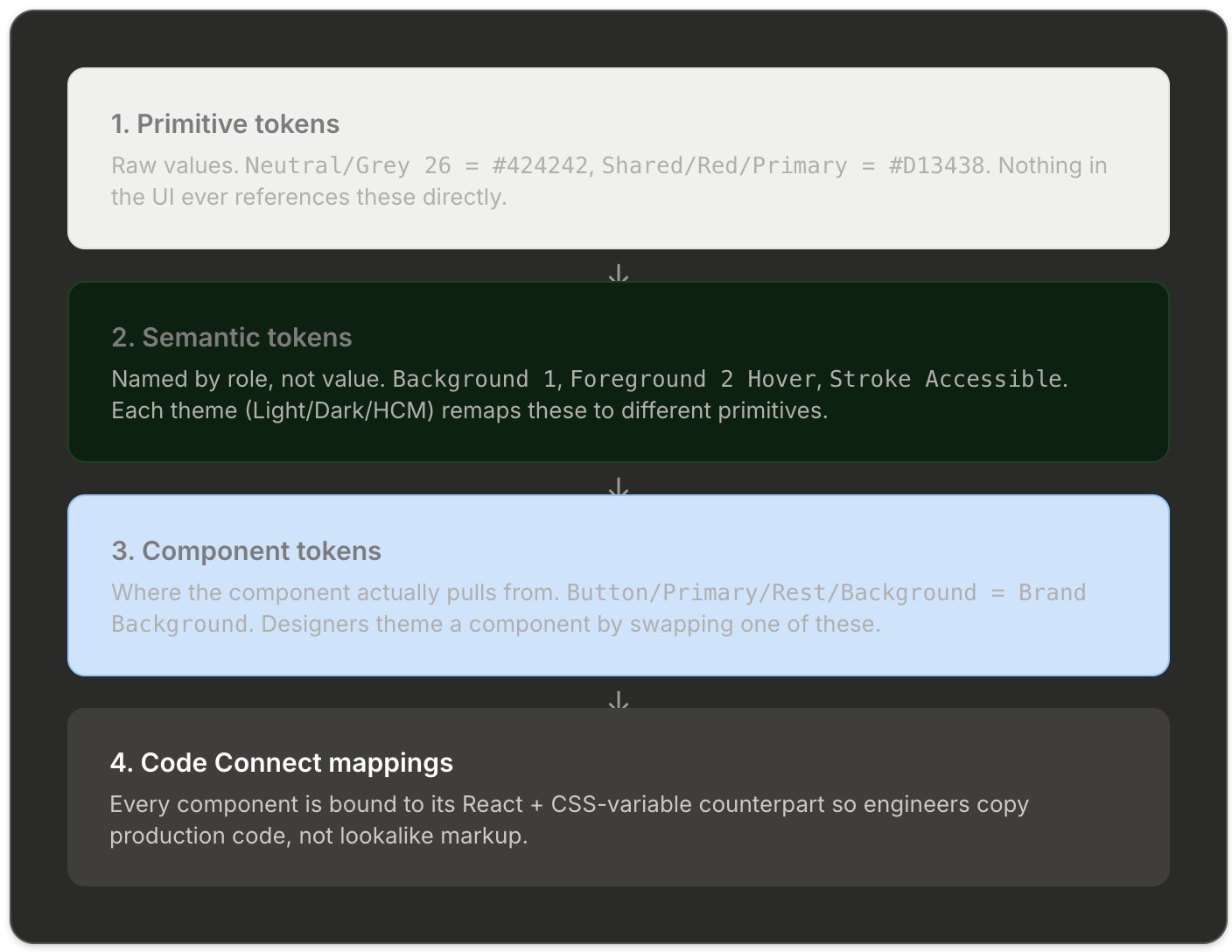The whole library is built on a four-layer token model. Every color, space, radius, and type style a designer touches resolves down through these layers to exactly one primitive. That's the rule that makes the system governable: rename the primitive in one place and the entire suite rethemes itself.