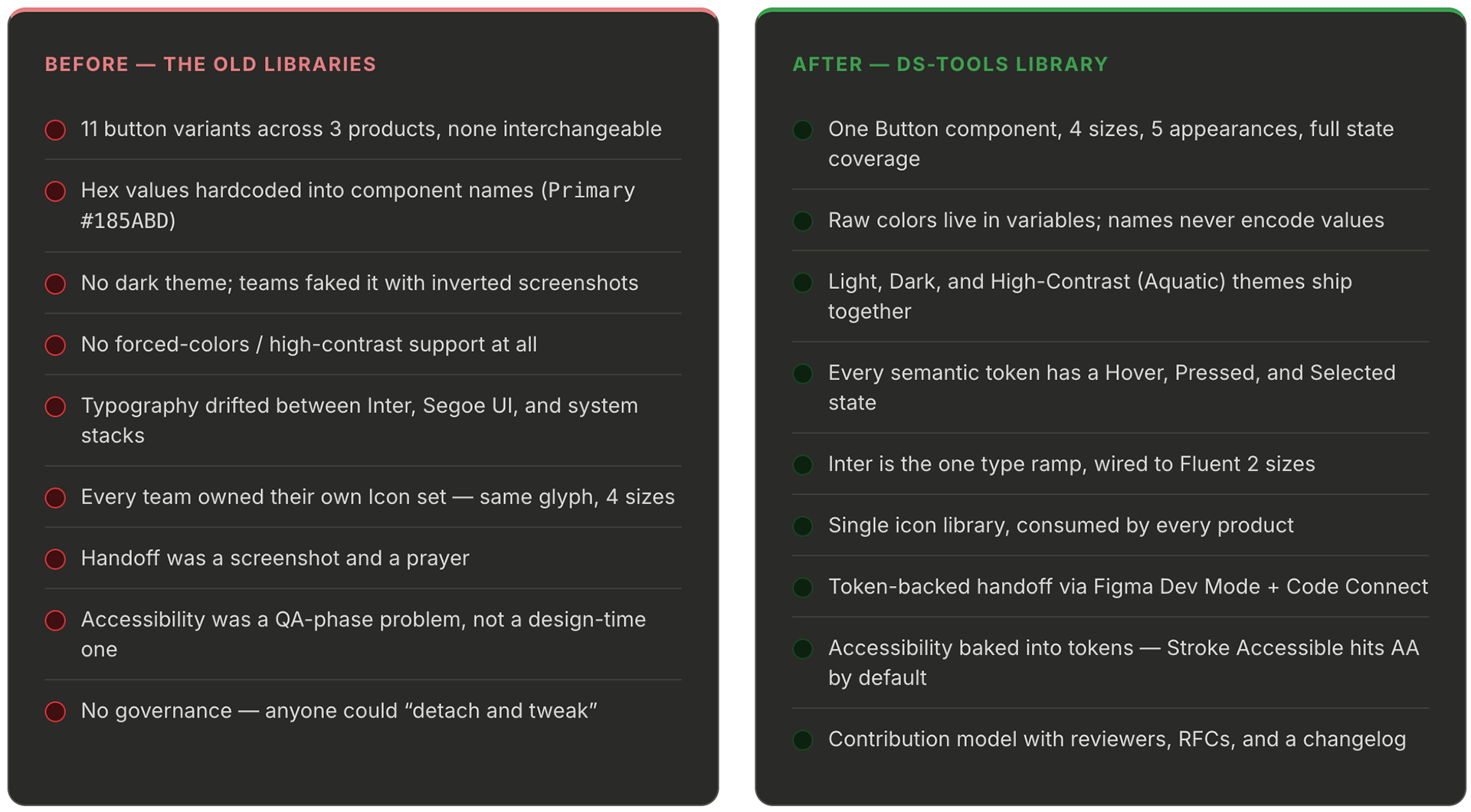 The version of DS-Tools we shipped is not finished — no design system ever is. Forced-colors mode needs to be completed, the icon library needs another pass, and component-level tokens need to land for Data Table. But the foundation is governed, the adoption curve is moving in the right direction, and the suite finally has a shared language. That's the win I was hired for.