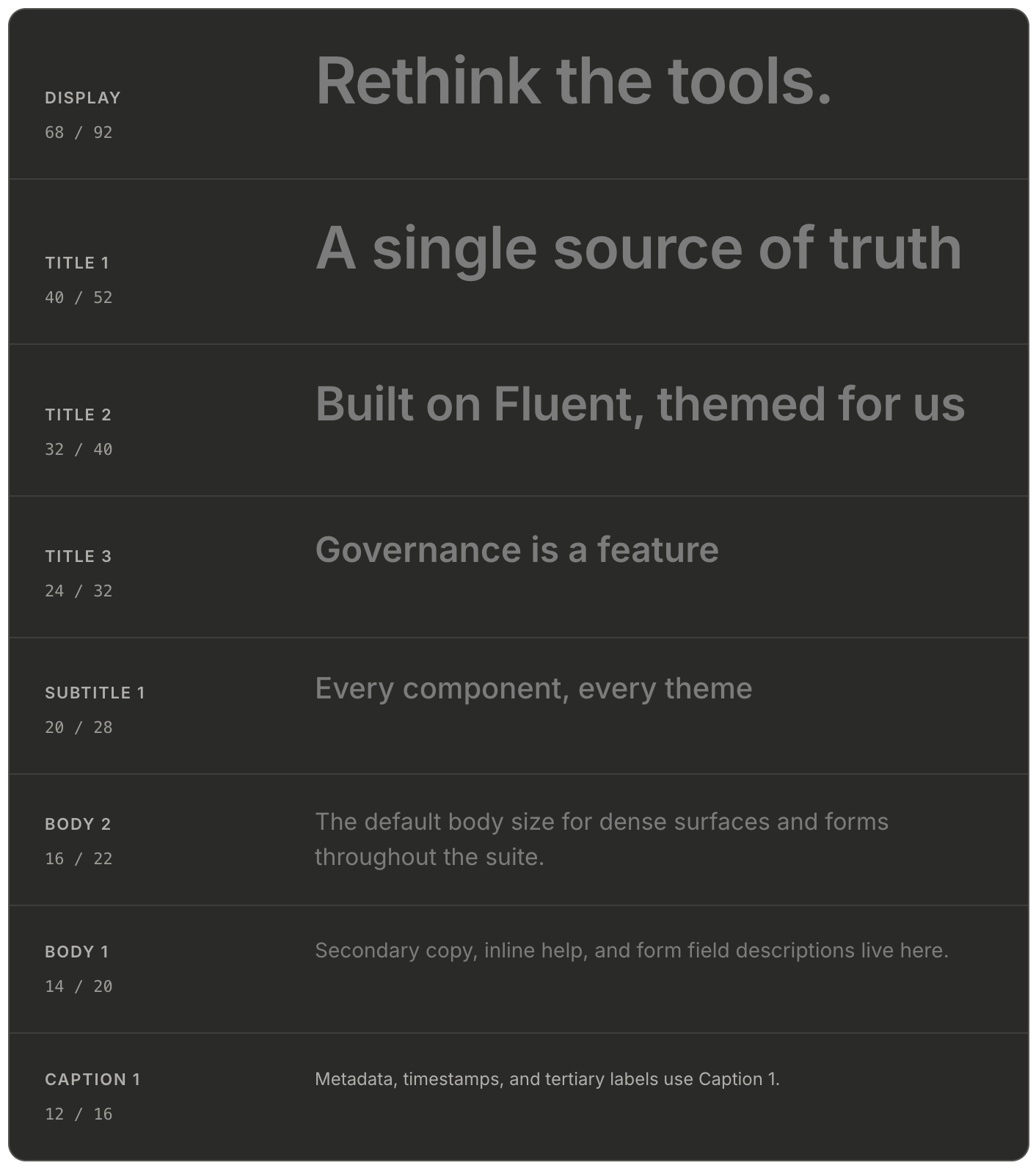 Typography was collapsed onto a single Inter ramp wired to the Fluent 2 web scale. Ten steps from Caption 2 to Display, each with tuned line heights. The old libraries had 23 text styles; the new one has 16 — and every one of them is referenced by a semantic role, not a pixel size.