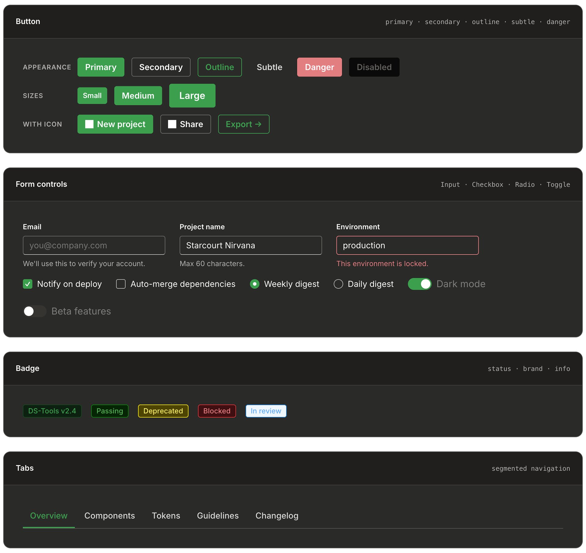 Every component below is rendered live using the exact DS-Tools tokens — same hex values, same type ramp, same border radii, same elevation recipes. If you change a token in the library, everything on this page would rethemed with it.