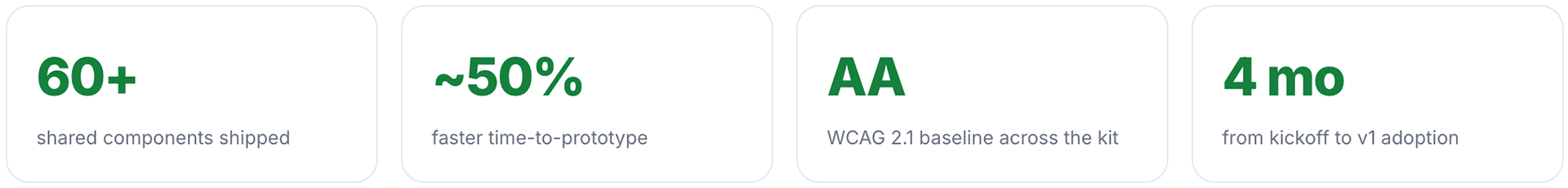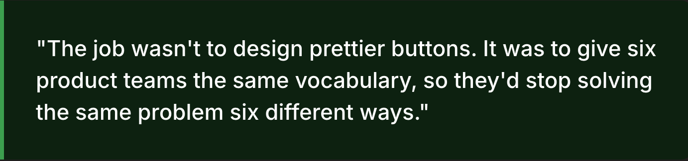 Accessibility presented a different kind of constraint: rather than overextending, I intentionally scoped high-contrast mode to a transparent, partially complete solution aligned with system semantics, prioritizing integrity over the illusion of completeness. Ultimately, the most complex challenge was governance—aligning six product teams on shared ownership—which I addressed through a federated contribution model that emphasizes structured RFCs, mandatory reviews, and documented changes, ensuring the system evolves deliberately rather than drifting back into inconsistency.