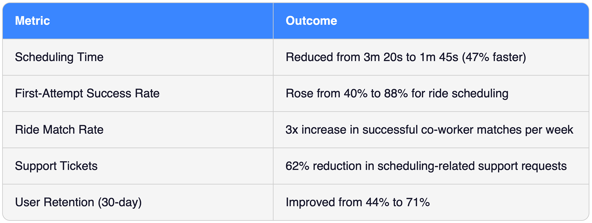 Usability testing with 25 employees showed that 60% couldn't complete a ride schedule on the first attempt without help.