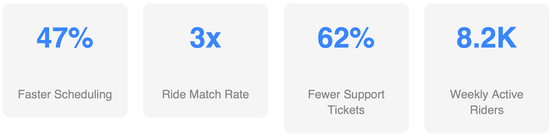 • Streamlined scheduling flow: Reduced the ride-booking steps from 7 screens to 4 with larger, more intuitive visual cues and a clear step indicator.